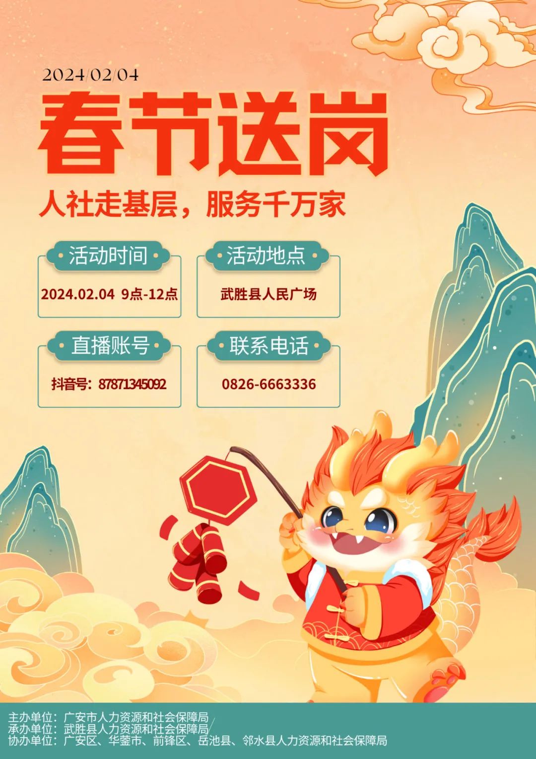 为更好地服务返乡农民工、高校毕业生等重点群体,坚持以习近平新时代中国特色社会主义思想为指导,宣传企业招聘信息和返乡就业创业扶持政策,2024年2月4日上午9点将在武胜县人民广场举办“人社走基层,服务千万家“大型招聘会活动,将本地优质岗位送到群众门口,把人社部门的服务送到群众身边,欢迎广大企业与市民踊跃参加!