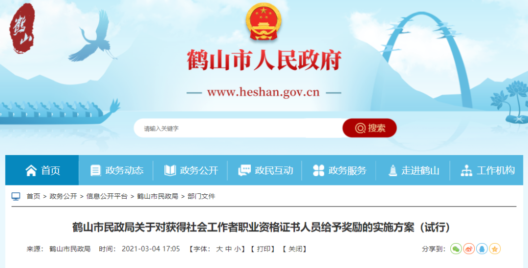 其中,2021年3月,鹤山市民政曾发布《鹤山市民政局关于对获得社会工作者职业资格证书人员给予奖励的实施方案》,参加社会工作者职业水平考试并获得证书,可申请奖励。