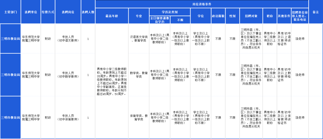 华东师范大学附属三明中学专技人员3名(详见附件1)。