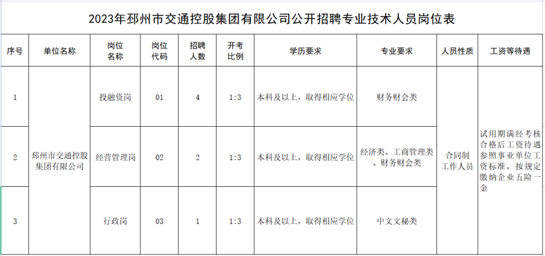 工资待遇等详见《2023年邳州市交通控股集团有限公司公开招聘专业技术人员岗位表》(附件1)。