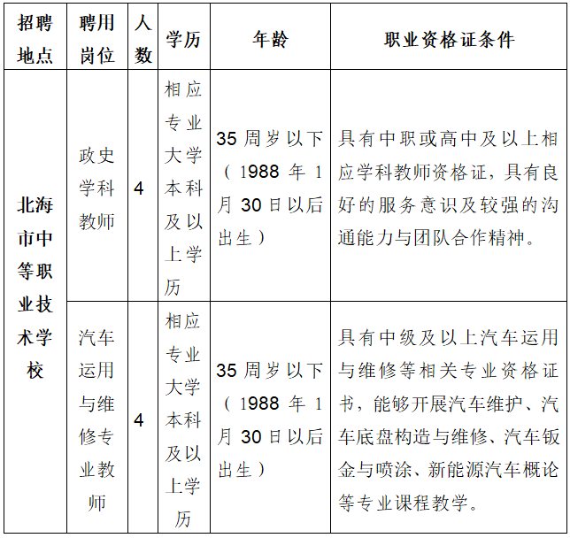 北海市中等职业技术学校创办于1981年,是一所历史悠久、文化多元、享誉区内外的国家级重点职业学校。学校占地面积300亩,现有教职工400多人,在校学生6000多人,开设有高速铁路乘务、邮轮乘务、民航运输服务、中餐烹饪、西餐烹饪、幼儿保育、汽车运用与维修、电子商务等 18 个品牌专业及特色订单班。其中自治区中等职业学校品牌专业 2 个,自治区职业教育示范特色专业 6 个。近年来,学校先后荣膺“首批全国文明单位”“全国教育系统先进集体”“国家中等职业教育改革发展示范学校”“广西壮族自治区首批五星级中等职业学校”等多项荣誉。为满足我校教育教学的需要,现向社会公开招聘编外聘用人员8名。采取公开、平等、竞争、择优原则,面向社会公开编外聘用人员。4.具有正常履行职责的身体条件,符合教师体检标准。(1)曾因犯罪受过刑事处罚的人员或曾被开除公职的人员;(2)在各级公务员招考和事业单位招聘中被认定有舞弊等严重违反录(聘)用纪律行为的人员。