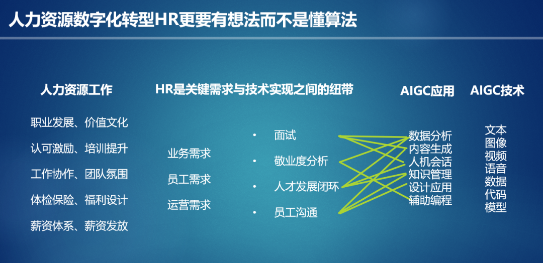 HR在人力资源数字化转型过程中的最关键作用,是把握企业人力资源管理当前的痛点和关键需求,并成为关键需求与技术实现之间的纽带。就拿AIGC技术来分析,AIGC技术无外乎就是生成文本、图像、视频、语音、数据、代码、模型等。相应的AIGC应用类型主要就是数据分析、内容生成、人机会话、知识管理、设计应用、辅助编程这些分类。了解了这些,HR就可以思考有哪些人力资源管理的痛点可能可以通过技术来解决。以面试为例,如果公司的招聘量大、候选人多,那么筛选简历、面试初筛就是HR工作的痛点。这时我们就可以想到,AIGC的数据分析可以帮助我们通过大数据筛选简历,AIGC的内容生成可以帮助我们生成笔试、面试问题,AIGC的人机会话可以帮助我们进行人工面试等等。