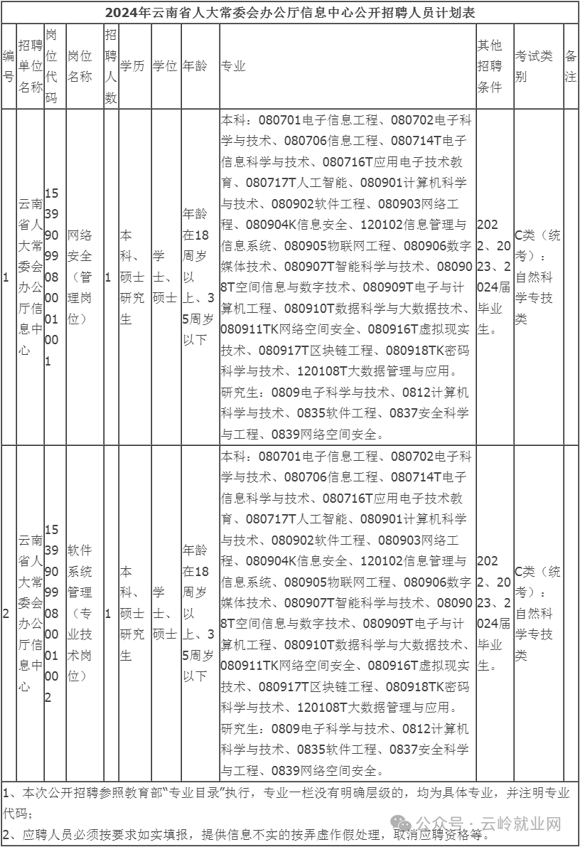 按照《事业单位公开招聘人员暂行规定》(人事部令第6号)《云南省事业单位公开招聘工作人员办法》(云人社发〔2016〕182号)等法律法规,根据工作需要,经云南省人大常委会办公厅和省人力资源社会保障厅批准,2024年云南省人大常委会办公厅信息中心面向社会公开招聘人员2名,现将有关事项公告如下:坚持德才兼备的用人标准,按照“公开、平等、竞争、择优”的原则,面向社会,公开报名,统一考试,综合评定,择优聘用。云南省人大常委会办公厅信息中心公开招聘人员2名。具体招聘岗位及招聘条件,详见《2024年云南省人大常委会办公厅信息中心公开招聘人员计划表》(附件1)。