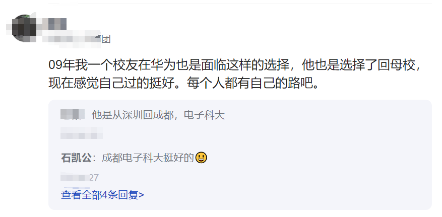 有其他网友,就爆料自己的校友也是这样的选择,在华为干了蛮长时间,后来,回了成都电子科大去教书。