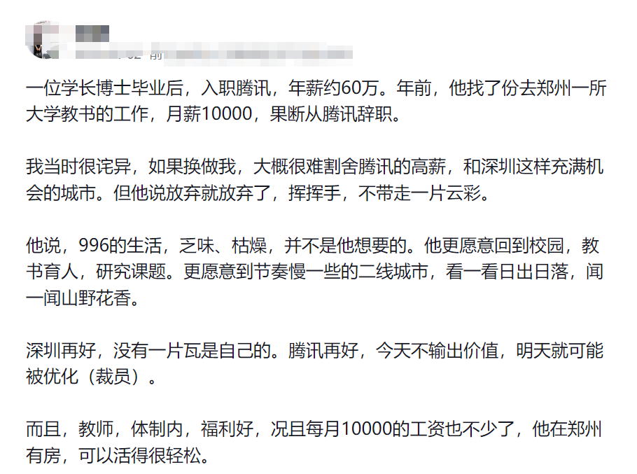 近日,有网友在社交媒体上爆料,自己的学长,博士毕业之后,入职了腾讯,年薪60万,但是最近直接果断的就从腾讯辞职了。原因是因为他的学长,找到了老家省会郑州一所大学教书的工作,月薪1万块,60万年薪变成1万的月薪,这个老铁表示非常惊讶,毕竟深圳城市这么好,腾讯工资这么高,又是大厂光环的,感觉挺可惜的。
