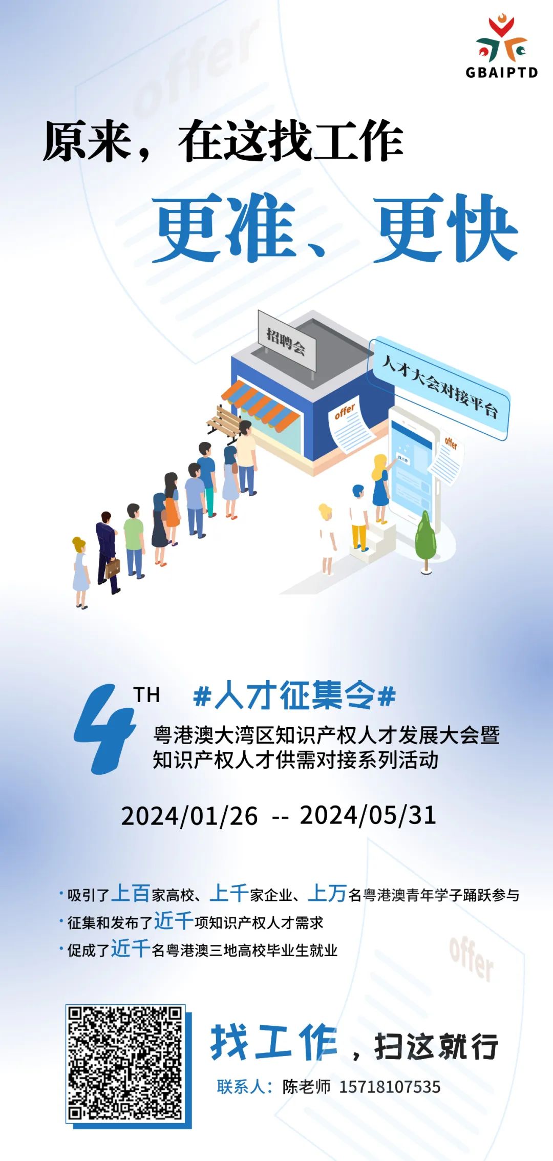 立足于知识产权人才的“供”与“求”,第四届粤港澳大湾区知识产权人才发展大会暨知识产权人才供需对接系列活动重磅来临,不仅为大湾区对知识产权人才有需求的企业及服务机构提供了丰富的知识产权人才库,更重要的是也为有意愿从事知识产权行业的有志之士提供了大量优质的岗位需求。