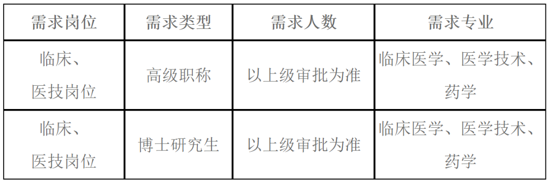 1.高级职称岗位:副高职称且博士学位或正高职称且硕士学位,原则上副高职称年龄不超过45周岁、正高职称年龄不超过50周岁,医院急需紧缺岗位年龄条件或学位条件可适当放宽,要求公立三甲医院工作5年以上。