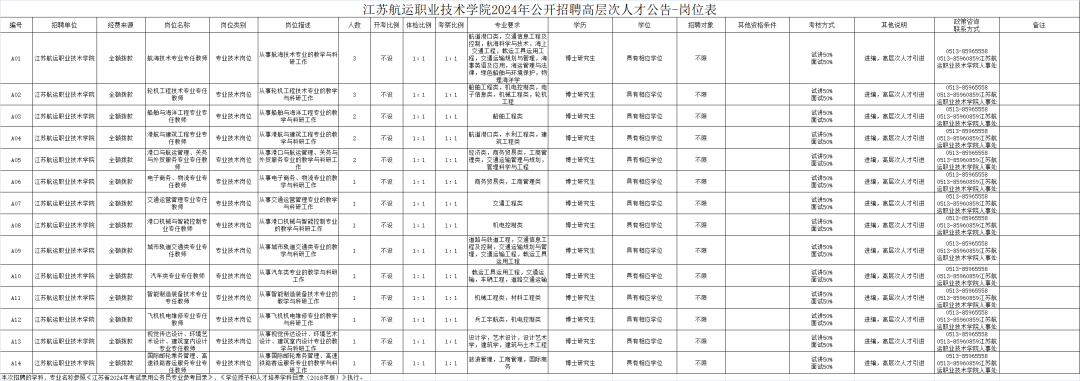 江苏航运职业技术学院(网址:http://www.jssc.edu.cn)是江苏省交通运输厅主管的全额拨款事业单位,江苏省高水平高职院校建设单位、中国特色高水平高职学校建设单位,位于江苏省南通市经济技术开发区通盛大道185号。为更好地选拔优秀适岗人才,充实人才队伍,优化师资结构,江苏航运职业技术学院现面向社会公开招聘高层次人才。根据《江苏省事业单位公开招聘人员办法》等规定,现将有关事项公告如下:(一)具有中华人民共和国国籍,遵守中华人民共和国宪法和法律。(二)遵纪守法,品行端正,团结同志,廉洁奉公,热爱高等教育事业,有良好的职业道德,有较强的事业心和责任感。(三)适应岗位要求的身体条件,能从事教学、科研、管理一线工作。(四)岗位年龄要求:博士研究生的年龄不超过40周岁(即1984年1月1日(含)后出生);具有副高级专业技术职务的年龄不超过45周岁(即1979年1月1日(含)后出生);具有正高级专业技术职务的年龄不超过50周岁(即1974年1月1日(含)后出生)。(五)具备报考岗位要求的专业、技能等资格条件(详见岗位表)。本次招聘的2024年毕业生须于2024年12月31日前毕业并取得学历学位证书。2022年和2023年普通高校毕业生,若仍未落实工作单位,其档案关系仍保留在原毕业学校,或保留在各级毕业生就业主管部门(毕业生就业指导服务中心)、人才交流服务机构和公共就业服务机构的,以及国(境)外同期毕业且已完成学历认证但仍未落实工作单位的人员,可应聘2024年毕业生岗位。国(境)外教学科研机构学习同期毕业人员,指在国(境)外教学科研机构学习,与国内2024年毕业生同期毕业的留学人员,同期毕业的时间要求与国内2024年毕业生一致。(六)取得祖国大陆普通高校学历的台湾学生和取得祖国大陆承认学历的其他台湾居民应聘时按国家和我省有关规定执行。应聘人员通过“江苏省属事业单位公开招聘平台”报名,照片上传、资格初审,均通过网络同步进行。报名网址:https://rs.jshrss.jiangsu.gov.cn/index/f/RCRS_0056(江苏省人力资源和社会保障厅网上办事服务大厅)1.报名、照片上传:2024年2月1日09:00-12月29日16:00。2.资格初审:2024年2月1日09:00-12月30日16:00。3.陈述申辩:2024年2月1日-12月31日工作日期间09:00-16:00。4.异议处理:2024年2月1日09:00-12月31日18:00。1.应聘人员网上提交报名信息48小时后(周末、节假日顺延),可到报名网站查询是否通过资格初审。2.本次公开招聘不收报名费和考试费,通过初审即报名成功。3.未按时在网上确认报名资格、上传照片的视为报名无效。1.应聘人员按岗位要求和网上提示,如实填写有关信息,并上传本人近期免冠正面二寸(35×45毫米)证件照,jpg格式,大小为20Kb以下。我校根据应聘人员提供的信息进行审核。应聘人员弄虚作假的,一经查实,即取消应聘资格。2.本次公告为长期招聘岗位,不设开考比例。自公告发布7个工作日之后,学校根据岗位报名情况,不定期启动考核程序,岗位招满即止。3.应聘人员只能从岗位表选择一个岗位报名。资格初审通过后,不可更改报名信息。未通过资格初审的应聘人员,在报名期内,可以改报符合资格条件的其他岗位。应聘人员要使用在有效期内的第二代居民身份证进行报名,报名与资格复审、考核时使用的身份证必须一致。(2)与事业单位负责人员有夫妻关系、直系血亲关系、三代以内旁系血亲关系或者近姻亲关系等亲属关系的,不得应聘事业单位的组织(人事)、纪检监察、审计财务岗位;与现有在岗人员存在上述关系的,不得应聘到岗后形成直接上下级领导关系的管理类岗位,以及《事业单位人事管理回避规定》明确应当回避的岗位;(3)新《江苏省事业单位公开招聘人员办法》于2020年3月13日起施行,根据其后发布的事业单位公开招聘人员公告,被聘用到江苏省地方各类事业单位3年服务期未满的在编(在册)人员;(4)2024年12月31日前,5年服务期未满的新录用公务员,或有规定(含协议明确)不得解聘离开工作单位(岗位)的人员,或国家和省另有规定不得应聘到事业单位的人员。学校根据公告要求组织资格复审和考核,考核方式为:试讲和面试。考核时间、地点及办法将通过江苏航运职业技术学院电话或电子邮件等方式通知资格初审已通过的应聘人员,应聘人员应按规定时间和地点参加考核,否则按弃考处理。复审工作由学校在应聘人员参加考核前进行,资格复审通过者方可参加面试。复审时须提交下列材料的原件和复印件:2.高等教育阶段的学历和学位须为普通高等学校学历和学位,本科及研究生各阶段学历、学位证书原件、复印件及学信网认证报告;在国(境)外取得的学历学位还须取得教育部中国留学服务中心的认证证明原件及复印件。3.国内2024年毕业生提供所在院校出具的省级教育行政部门统一印制的《毕业生双向选择就业推荐表》原件及复印件。4.专业技术职务证书、职业资格证书,市(厅)级及以上科学研究课题结项证书、教学和科研成果奖励证书,各类行政性奖励证书,本人真实的教学与研究方向、主要论文论著的列表(注明期刊名称,年、期和起止页码)以及能体现个人科研水平的学术论文等相关材料原件及复印件。试讲内容以招聘岗位要求的相关专业知识及综合能力为主,主要考核应聘人员的教育教学能力,对课堂教学目标、教学内容、教学方法、教学组织及教学效果作出评价。试讲成绩合格线为60分(满分100分),