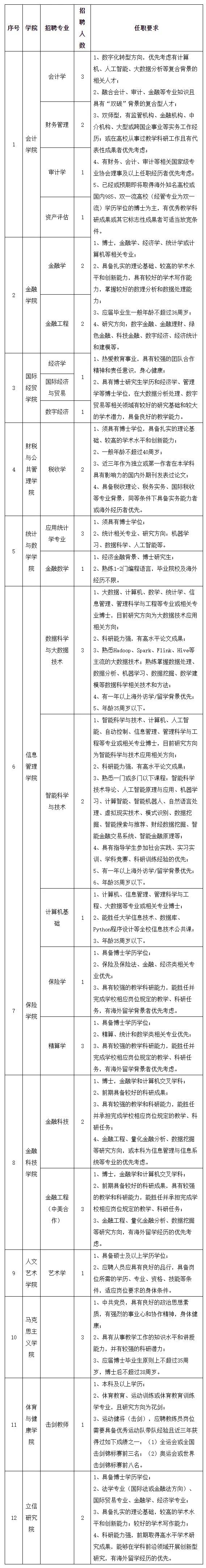 常任轨教师:为学校高层次人才的预备培育“蓄水池”,面向海内外优秀青年才俊,专业为会计学、审计学、公司金融、数字金融、金融理财、绿色金融、国别金融、科技金融、宏观经济、区域经济、数字经济、经济统计和建模等专业,薪资待遇面议。