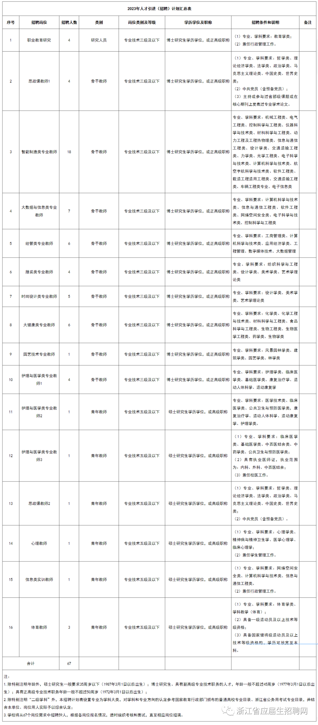 根据《事业单位人事管理条例》(国务院令第652号)、《事业单位公开招聘人员暂行规定》(人事部令第6号)等有关规定,因工作需要,我校决定面向社会公开招聘专任教师、研究人员。现将有关事项公告如下:杭州职业技术学院是杭州市人民政府主办的全日制高职院校,位于杭州钱塘区下沙高教园区。学校现为双高计划高水平建设学校(B档)、国家骨干高职院校、国家优质专科高等职业院校、浙江省示范性高职院校和浙江省优质高职院校建设单位,先后荣获全国黄炎培职业教育奖“优秀学校奖”“全国高职院校就业竞争力50强”“高等职业院校服务贡献50强”“全国高职院校创新创业示范校50强”“全国创新创业典型经验高校50强”等荣誉。2023年我校拟从67个岗位需求中招聘59人,按招聘先后顺序招满即止,具体招聘岗位、人数和招聘条件详见《附件1:杭州职业技术学院2023年人才引进(招聘)计划汇总表》。