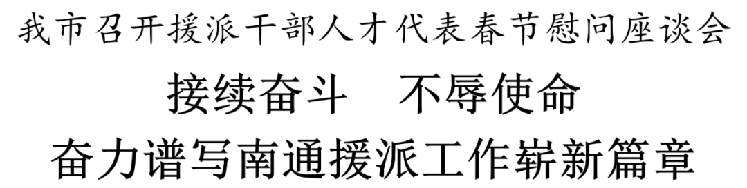 2月2日,我市召开援派干部人才代表春节慰问座谈会,交流前方工作情况,谋划下一步工作打算。市委书记吴新明出席会议并讲话,强调要全面落实习近平总书记关于东西部协作和对口支援工作的重要论述,紧紧围绕党中央决策部署和省委、市委工作要求,接续奋斗、不辱使命,努力把南通援派工作打造成为推动发展的工程、民族团结的工程、凝聚人心的工程。市委副书记、市长张彤主持会议。