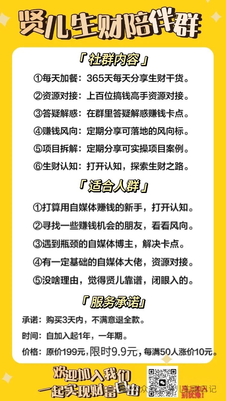【贤儿,阿德七年合伙人,有一个生财陪伴群,价格不贵,9.9元即可进群,每天分享干货,让贤儿365天陪伴您,进群可以后台回复“陪伴群”】