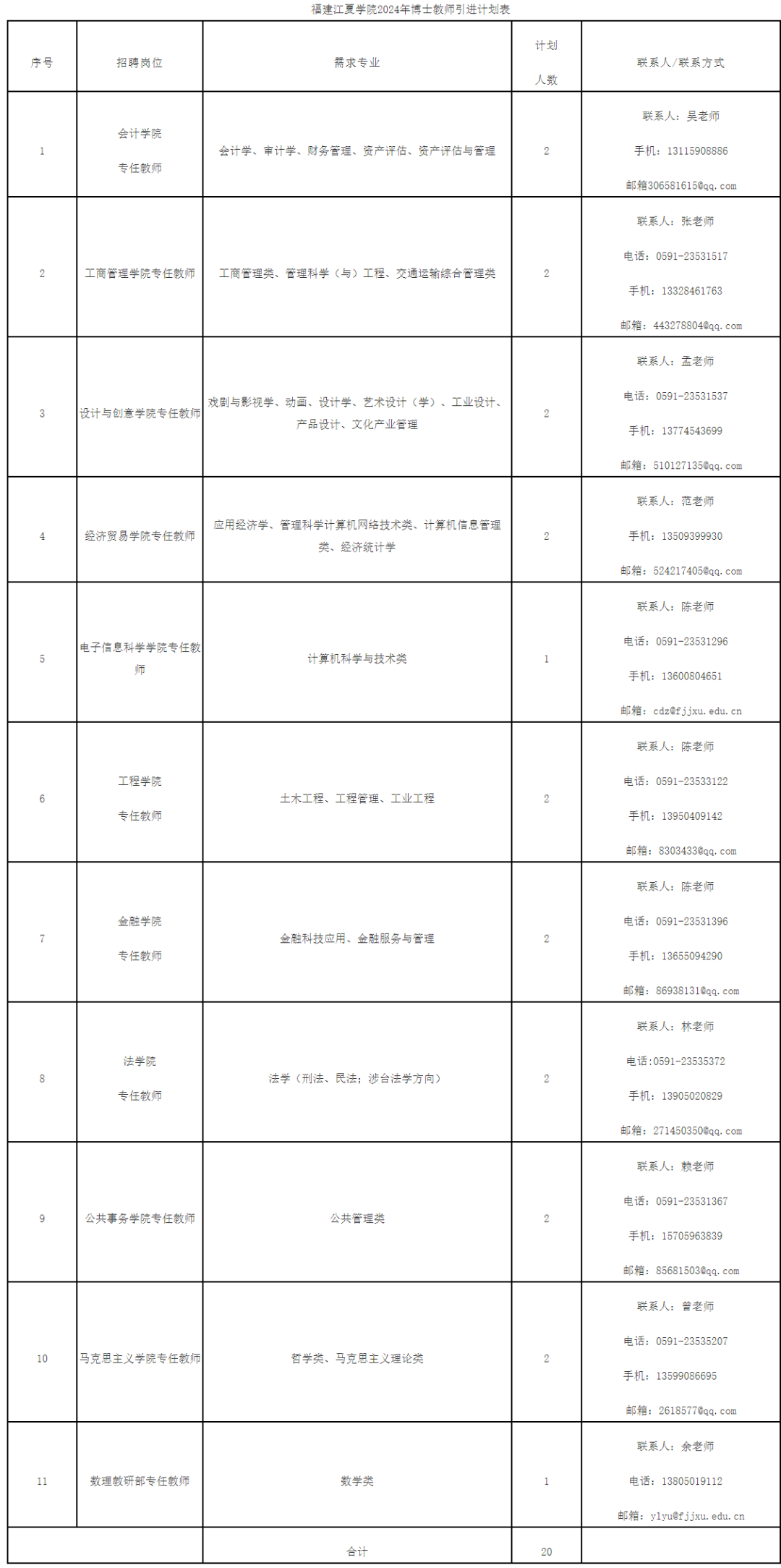 福建江夏学院是福建省人民政府举办的省属全日制普通本科高校。学校由福建经济管理干部学院、福建财会管理干部学院、福建省政法管理干部学院、福建金融职业技术学院合并组建,于2010年3月经教育部批准正式建立,办学历史可追溯到1957年。校园规划面积1388.4亩,主校区坐落于福州地区大学城。根据学院发展需要,拟在人员控制总量内向社会公开招聘高层次人才20名。根据《福建省省属事业单位公开招聘工作人员考试暂行办法》的规定,制定具体方案如下:1.具有中华人民共和国国籍,拥护中国共产党的领导,热爱社会主义,遵纪守法,品行端正。2.身心健康,符合我省现行的教师资格申请人员体检标准。3.年龄要求:原则上教授年龄要求为18周岁以上、45周岁及以下(1978年1月至2006年1月期间出生),副教授年龄要求为18周岁以上、40周岁及以下(1983年1月至2006年1月期间出生),博士研究生报考者年龄要求为18周岁以上、35周岁及以下(1988年1月至2006年1月期间出生)。4.招聘岗位均要求具有博士研究生学历学位。取得境外学历学位报考者应提供教育部留学服务中心出具的学历学位认证书。学历学位认证书等各项资格认定证书落款时间截止为2024年12月31日。