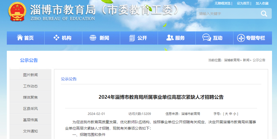为促进淄博市教育高质量发展,优化教师队伍结构,按照事业单位公开招聘有关规定,决定开展淄博市教育局所属事业单位高层次紧缺人才招聘,现就有关事项公告如下: