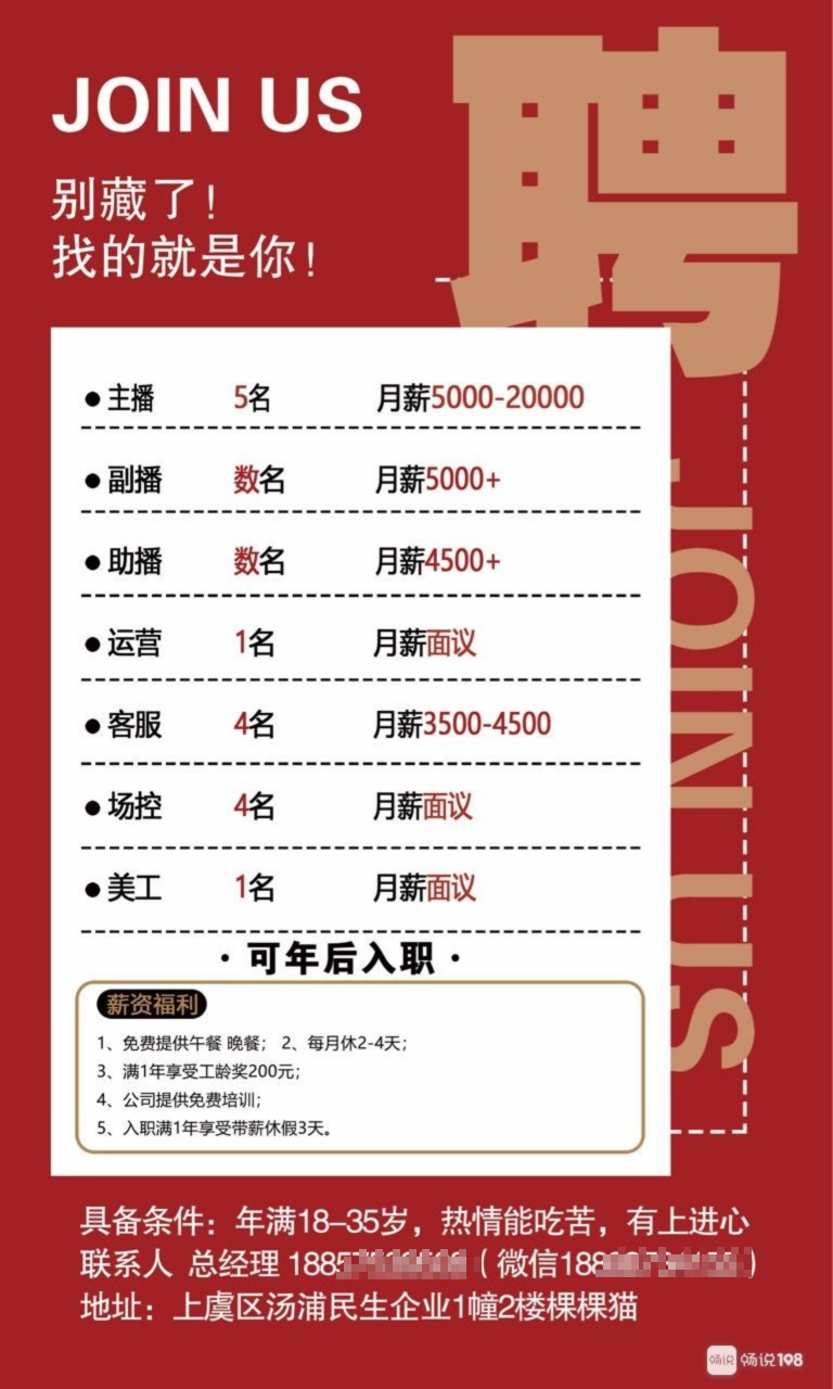 2、【招聘主播、副播、助播、运营、场控、客服、美工】: