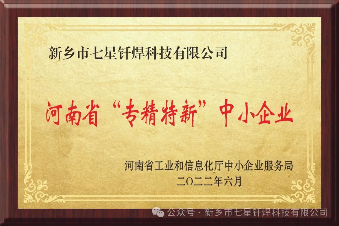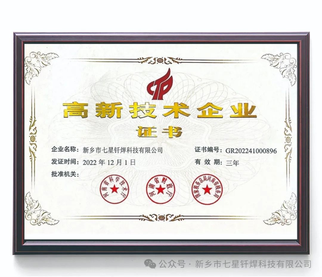 近年来,公司先后荣获了国家高新技术企业、河南省“专精特新”中小型企业、河南省新型钎焊材料工程技术研究中心、河南省科技型中小企业、河南省知识产权优势企业、河南省十大诚信品牌企业、河南省“工人先锋号”、中国有色金属加工工业协会副会长单位、中国焊接协会会员单位、中国电子节能技术协会副理事长单位、中国制冷产业联盟副会长单位、新乡市质量标杆企业等资格认定和诸多殊荣,并成功跻身省定重点上市后备企业队伍。