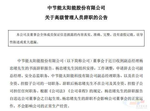 太阳能显示,杨忠绪因组织安排,工作调整,申请辞去公司副总经理、安全总监职务,中节能太阳能科技有限公司副总经理职务,以及在公司全资、控股子公司的一切职务。辞职后杨忠绪不在公司及其全资、控股子公司担任任何职务。