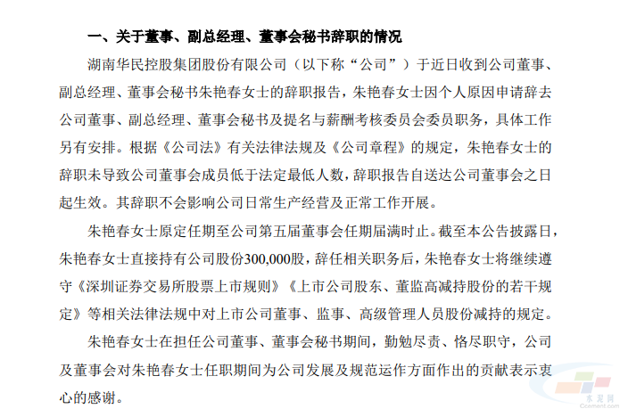 同日,华民股份发布公告称,公司于近日收到公司董事、副总经理、董事会秘书朱艳春的辞职报告。