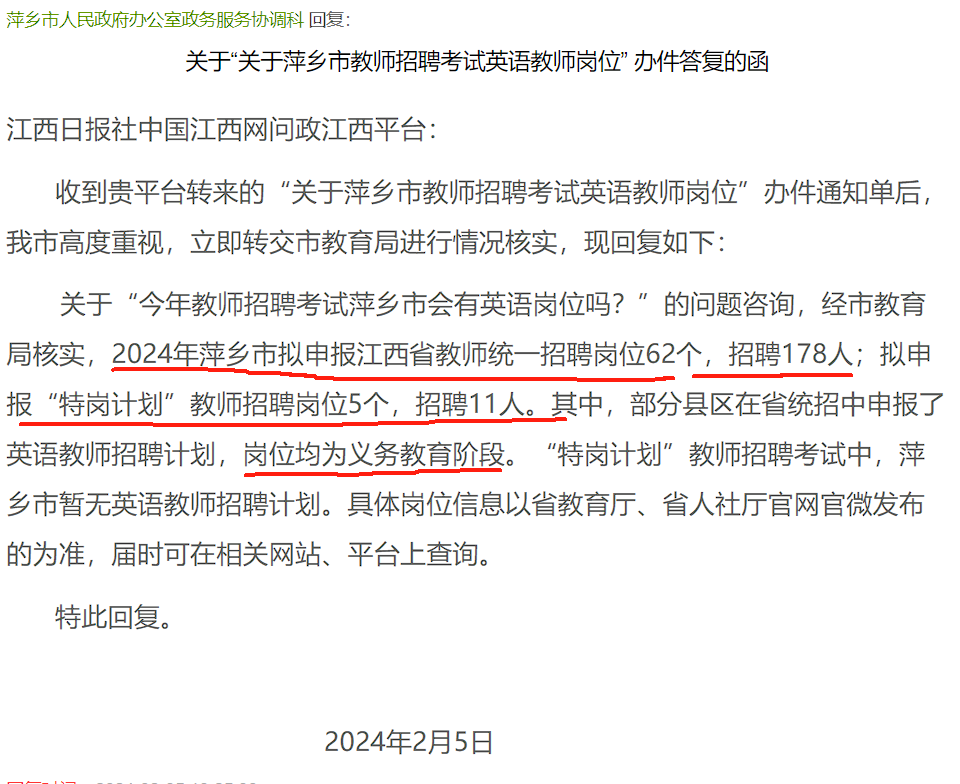 萍乡市24年教招计划招聘教师189人