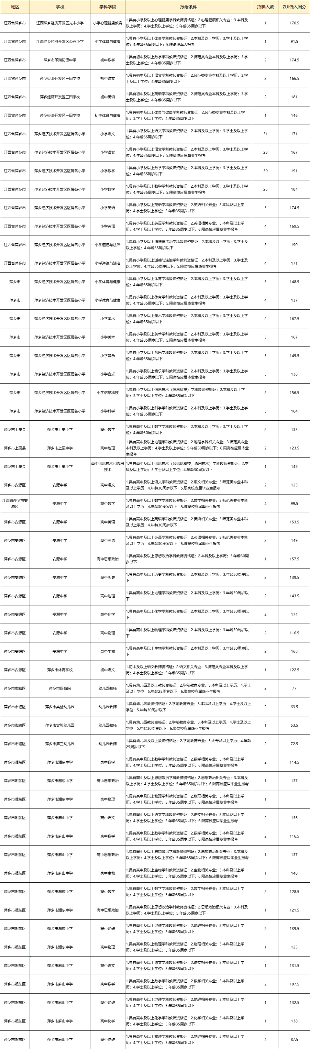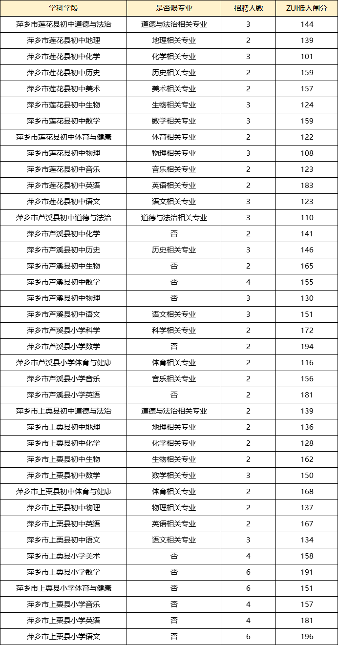 初中ZUI低平均入闱分141.20分,仅芦溪县初中物理、化学、生物、数学不限专业,其它学科均要求相关专业。