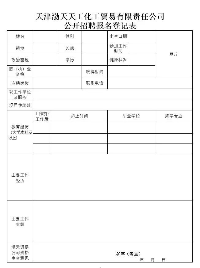 《天津渤天天工化工贸易有限责任公司公开招聘报名登记表》