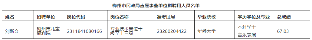 根据《广东省事业单位公开招聘人员办法》(省政府令第301号)和《梅州市事业单位2023年下半年集中公开招聘高校毕业生公告》规定,经过报名、笔试、资格审核、面试、体检、考察等程序,经审核,拟聘用刘斯文同志为梅州市民政局下属事业单位工作人员,现予以公示(名单附后)。