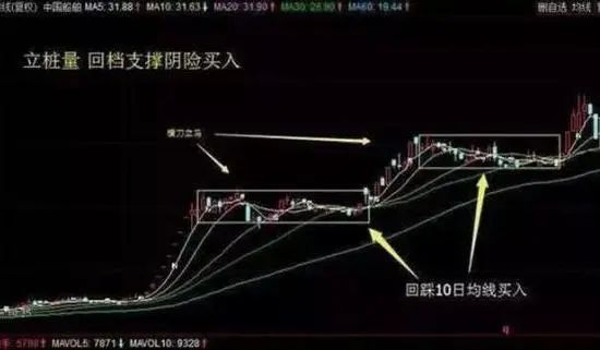 2、立桩量回档,阴线买入法股市价格在上升行情中成交量突然放出巨量,进而股价开始拉升,到一定的点位开始盘整,回踩10日均线阴线买入,明后天,会再次突破