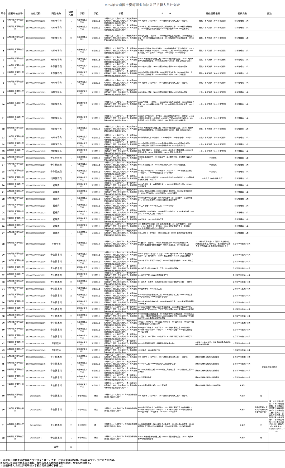云南国土资源职业学院公开招聘人员58名;具体招聘岗位及招聘条件,详见《2024年云南国土资源职业学院公开招聘人员计划表》(附件1)。
