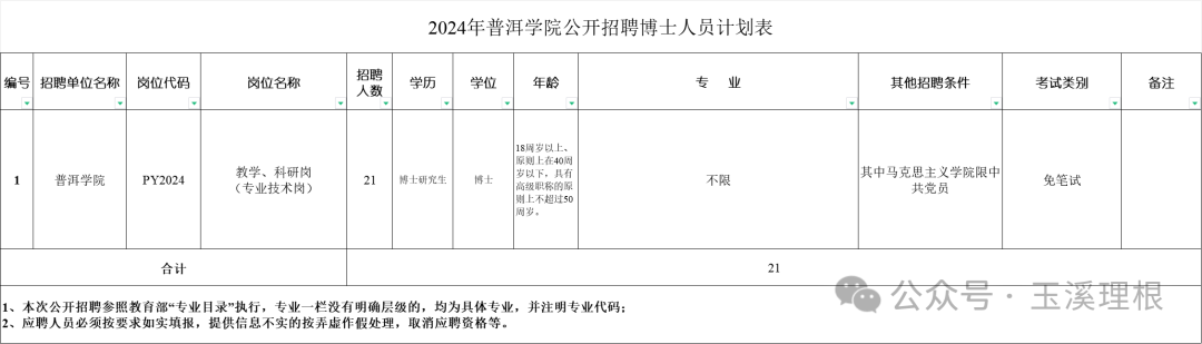 按照《事业单位公开招聘人员暂行规定》(人事部令第6号)《云南省事业单位公开招聘工作人员办法》(云人社发〔2016〕182号)等法律法规,根据工作需要,经云南省教育厅和云南省省人力资源和社会保障厅批准,2024年普洱学院面向社会公开招聘博士人员21名,现将有关事项公告如下:
