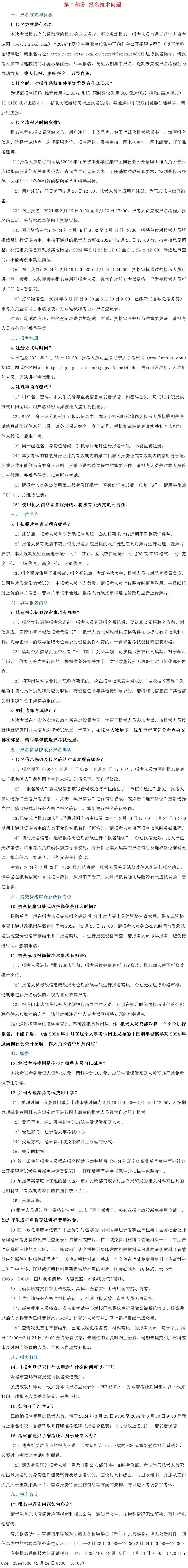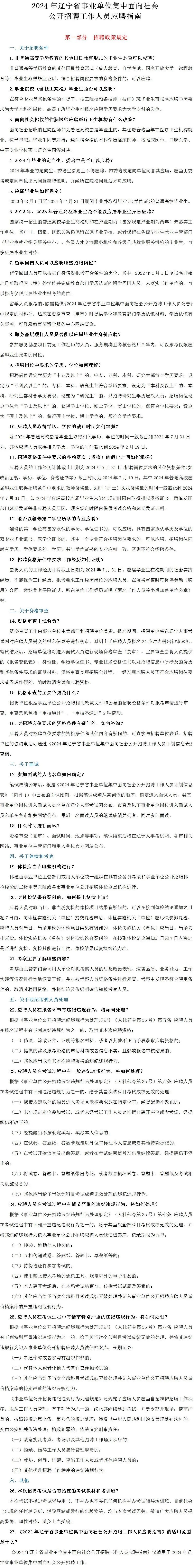 2024年辽宁省事业单位集中面向社会公开招聘工作人员公告为加强事业单位人才队伍建设,持续优化人才队伍结构,积极促进高校毕业生就业,根据《事业单位人事管理条例》《辽宁省事业单位公开招聘人员办法》等规定,全省事业单位拟集中面向社会公开招聘工作人员,现将有关事项公告如下。招聘对象为符合招聘基本条件和招聘岗位具体资格条件的普通高、中等(职业)院校2024年应届毕业生及社会在职、非在职人员。(四)具备岗位所需的专业或技能条件,适应岗位要求的身体条件;(五)岗位所需要的其他条件,详见《2024年辽宁省事业单位集中面向社会公开招聘工作人员计划信息表》(附件1)(见文中最下方)。其中,在符合专业等其他条件的前提下,技工院校预备技师(技师)班毕业生可报名应聘学历要求为大学本科的岗位,高级工班毕业生可报名应聘学历要求为大学专科的岗位。面向社会招收的住院医师如为普通高校应届毕业生的,其住培合格当年在医疗卫生机构就业,按当年应届毕业生同等对待;经住培合格的本科学历临床医师,按临床医学、口腔医学、中医专业学位硕士研究生同等对待。招聘岗位限定本市、县(市、区)户籍的,应聘者应于本公告发布前迁入,且在开始报名时仍为该市、县(市、区)户籍〔该市、县(市、区)生源2024年当年毕业的普通高校应届毕业生视为具有该市、县(市、区)户籍〕,并符合其他资格条件。现役军人、在读的普通高校非应届毕业生不能应聘;曾因犯罪受过各类刑事处罚的,有犯罪嫌疑尚未查清或正在接受纪律审查的,聘用后即形成回避关系的,以及国家法律法规规定不得聘用的其他人员,均不得应聘。应聘人员年龄原则上不超过35周岁(1988年2月19日及以后出生),2024年当年毕业的应届硕士、博士研究生以及在脱贫攻坚、乡村振兴、疫情防控等重大工作中获省辖市市以上党委、政府或省级以上部门表彰的,年龄可放宽到40周岁(1983年2月19日及以后出生)。招聘岗位对年龄条件有特殊要求的,按岗位要求的年龄条件执行,具体出生日期的计算方法同上。应聘人员的工作经历计算截止日期为2024年7月31日,其他资格条件或相关资历的计算截止日期为报名起始之日。海外院校毕业生取得的学历学位证书应获得国家教育部认证。2024年普通高校应届毕业生可先行报名及考试,经考试、体检、考察、公示并于2024年7月31日之前取得毕业证书、学位证书及招聘条件中要求的教师资格证、医师(护士)执业资格证的,可按规定聘用,否则不予聘用。如2024年普通高校应届毕业生未能在规定时限内取得相应资格证书,确属发证部门延期发证等非应聘人员原因,须在规定时限内提供考试合格和延期发证证明,待取得相应资格证书后,再办理聘用。(www.lnrsks.com,下同)上统一发布,具体见《2024年辽宁省事业单位集中面向社会公开招聘工作人员计划信息表》(附件1)。对招聘资格条件中的专业、学历、其他条件及备注内容等信息需要咨询时,应聘人员可直接拨打该岗位右侧招聘单位联系电话,由招聘单位具体负责解释说明。为方便应聘,我们就招聘政策、报名网络技术等事宜编制了《2024年辽宁省事业单位集中面向社会公开招聘工作人员应聘指南》(附件2),请应聘人员认真阅读。本次招聘由应聘人员登录辽宁人事考试网采取网上报名的方式进行,网上报名实行诚信承诺制度,符合招聘基本条件和岗位资格条件的应聘人员,认真阅读报名承诺书并确认后,填写《2024年辽宁省事业单位集中面向社会公开招聘工作人员报名登记表》,进行网上报名,网上报名程序如下:1.提交报考申请和上传本人电子照片。应聘人员可在2024年2月19日9:00至2月23日17:00登录辽宁人事考试网,填写报名信息,提交报名申请并上传本人近期免冠正面电子证件照片(红底、蓝底或白底证件照,JPG或JPEG格式,照片宽度不低于215像素,高度不低于300像素)。2.查询审查结果。报名期间,招聘单位将对应聘人员提交的报名信息等进行初审,原则上应在应聘人员提交报名信息24小时内提出初审意见。应聘人员可于2024年2月19日9:00至2月24日12:00登录辽宁人事考试网查询审查结果。通过审查的,不能再报考其他岗位。未通过审查的,可在2024年2月23日17:00前改报其他岗位,2024年2月23日17:00至2月24日12:00,未通过审查的,不能再改报其他岗位。考生对初审结果需要咨询的,可按照公布的咨询电话,向招聘单位咨询。3.缴费确认。应聘人员通过审查后,须于2024年2月19日9:00至2月24日24:00登录网上报名系统缴纳考试费。考试费每科50元,两科合计100元。支付考试费后务必重新登录报名系统确认“缴费成功”即为报名程序结束。未按期缴费者视为自动放弃考试。最低生活保障家庭应聘人员,可享受减免考试费,请符合条件人员在报名缴费环节主动申请并提交相关证明材料。辽宁省人事考试中心将对接国家最低生活保障查询系统核查,核查通过的考生可减免考试费,不通过的务必在缴费期限内重新缴费。已缴费的应聘人员,于2024年3月25日9:00至3月30日9:00登录辽宁人事考试网,自行打印准考证、报名登记表(A4纸,一式两份),并妥善保管。1.每名应聘人员只能报考一个招聘岗位。每个岗位有效报名人数与招聘人数达不到最低开考比例(具体见《2024年辽宁省事业单位集中面向社会公开招聘工作人员计划信息表》)时,将取消或削减该岗位招聘计划,相关信息在
