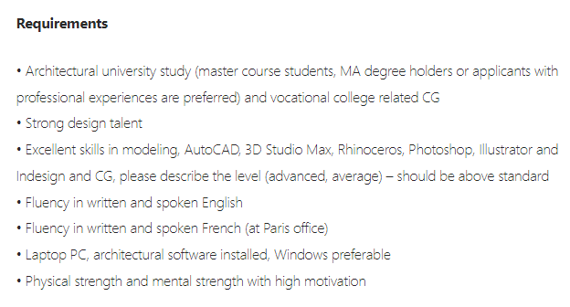 - 优秀的造型技巧,AutoCAD,3D Studio MAX,Rhinoceros,Photoshop,lluStrator,InDesign和CG(会其他语言一一特别是中文(普通话)、韩语、法语、西班牙语、德语意大利语和日语一一强烈推荐(在东京办公室)在复杂的环境中积极主动、自律、自信,工作努力,有团队合作精神,准确、准时、动手、有条理。)
