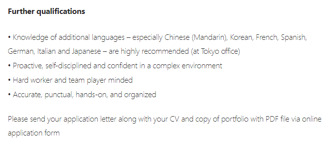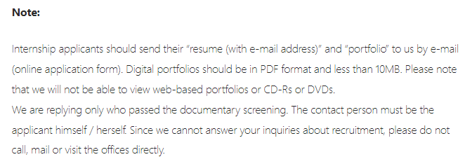 实习申请者请将“个人简历(注明电子邮件地址)”和“作品集”通过电子邮件 (在线申请表)发送给我们。请注意,我们将无法查看基于Web的投资组合或CD-R或DVD。(https://kkaa.co.jp/en/recruit/internship/)IMPACT STUDIO仅提供招聘信息整理