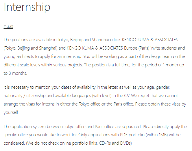 限研吾建筑设计事务所 (东京、北京、上海)和限研吾建筑设计事务所欧洲(巴黎) 诚邀学生和年轻建筑师申请实习机会。你将作为设计团队的一员,在不同规模的项目中工作。该职位为全职,为期1个月至3个月。网站申请时请提及您的可用日期,以及您的年龄,性别,国籍/国籍和可用的语言(与水平) 在简历中。请自行办理东京办事处或巴黎办事处的签证。- 建筑类大学学习(硕士生、硕士生或有相关工作经验者优先)和职业院校CG相关专业
