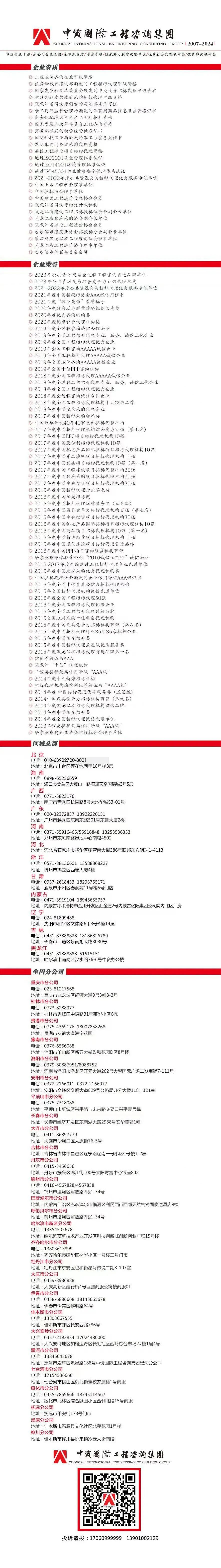 中资国际工程咨询集团有限责任公司,坐落于哈尔滨,集团成立于2007年7月,注册资本8700万元。集团在北京、雄安、广东、广西、河南、甘肃、内蒙古、吉林、辽宁、海南等地设立四十家分支机构。哈尔滨市现有8个办公区,总面积约为7000平方米。集团积极响应国家政策,近年通过并购、重组,整合各专业领域机构,集投资咨询、环评、设计、测绘、招标代理、监理、项目管理、造价、审计、PPP、绩效评价、公平竞争审查、项目验收等全方位、多元化的全国性咨询服务企业目标发展。