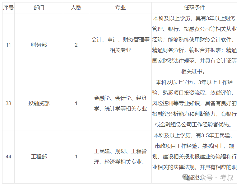 现因工作需要,拟面向社会公开招聘人才,此次招聘涉及财务部、投融资部、工程部三个部门,现将有关事项公告如下: