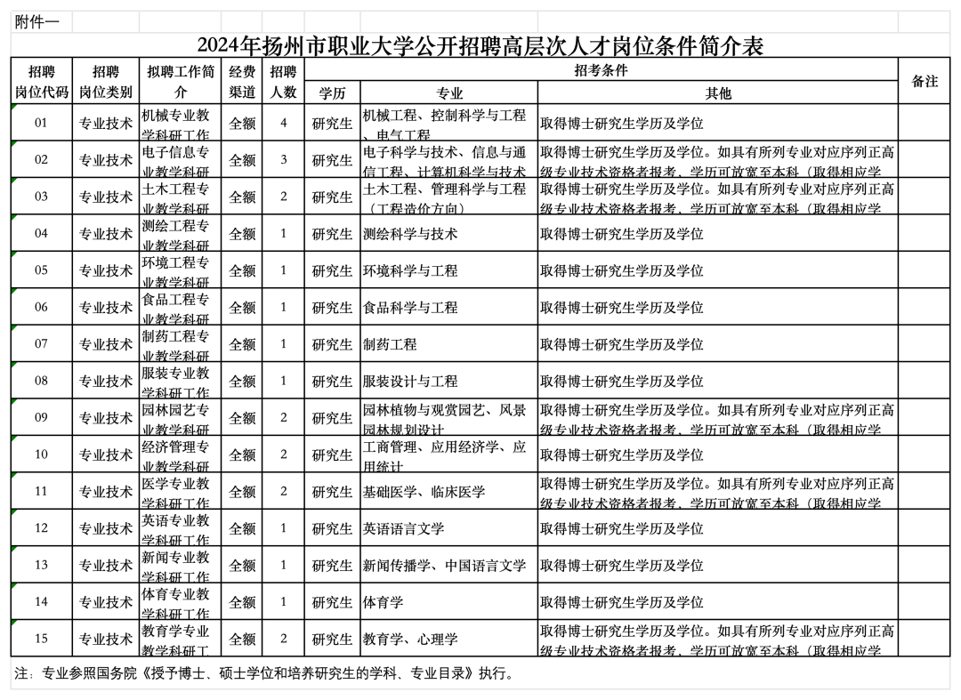 附件一:2024年扬州市职业大学公开招聘高层次人才岗位条件简介表.xls