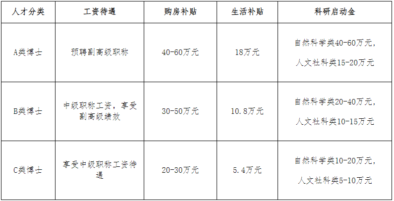 对于A、B、C三类博士,且符合下列条件的,可同时享受以下待遇: