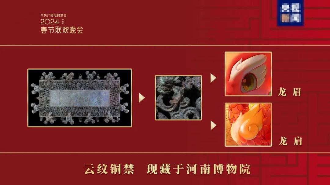 眉弓和龙肩上的装饰取自河南博物院收藏的云纹铜禁纹饰,精美别致,增添了吉祥物的趣味和古韵。