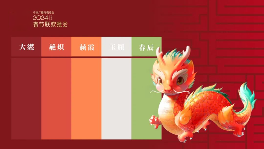 配色上,春晚吉祥物采用了大繎、赩炽、赪霞、玉頩、春辰等中国传统色。