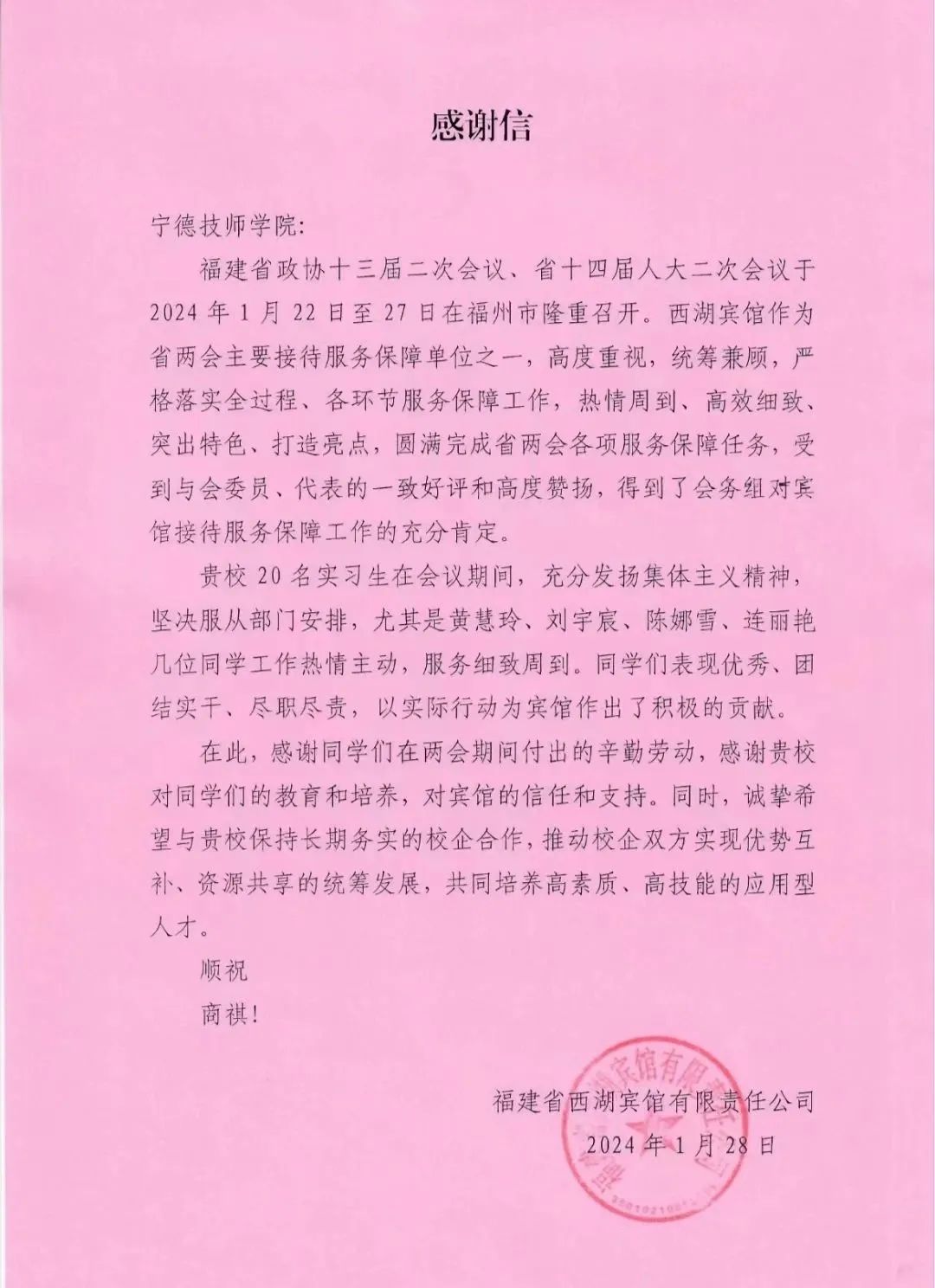 近日,宁德技师学院2021级酒店管理1班的20名同学因在实习工作中表现出色,获得了高度肯定,福建省西湖宾馆特向我院发来了感谢信。