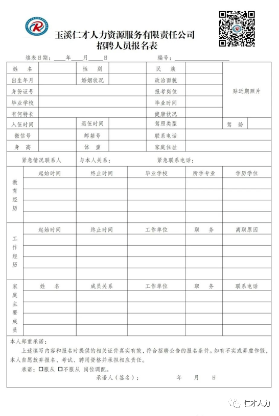 附件:玉溪仁才人力资源服务有限责任公司招聘人员报名表。