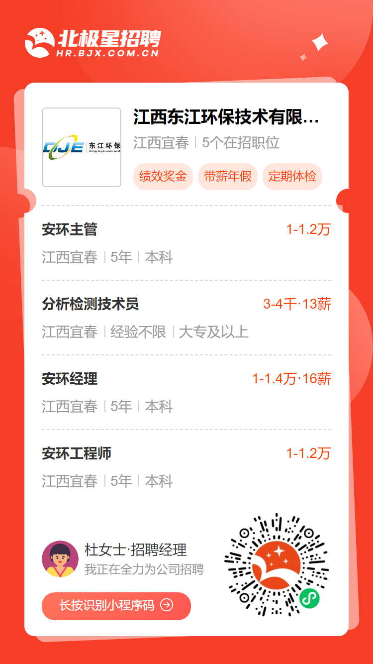 >包吃包住、五险一金,江西东江环保16薪招聘安环经理