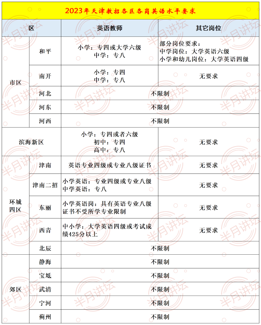 最近很多英语没有过专四专八的同学 咨询天津英语教师编对英语水平的要求,担心自己考不了~。其实,天津教师编很多英语教师岗位是没有要求英语等级的,而部分非英语岗要求了英语等级,小编今天总结了2023天津教招各区各岗英语水平要求,一起来看看吧~