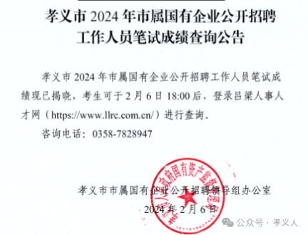 >孝义2024年市属国企招聘笔试成绩查询公告