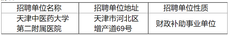 招聘方案于2024年2月8日在天津卫生人才网(www.tjwsrc.com)天津中医药大学第二附属医院门户网站(www.tjzyefy.com)公告通知专栏发布。具体招聘岗位见《天津中医药大学第二附属医院2024年第二批人事代理人员招聘计划(非应届)》(详见附件)。
