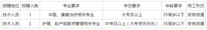 5.中医康复治疗相关专业:具有国家承认的相关专业全日制大专及以上学历,能胜任相关岗位工作;具有良好的品行和职业道德;取得医师(技术)资格证、有工作经验者优先。