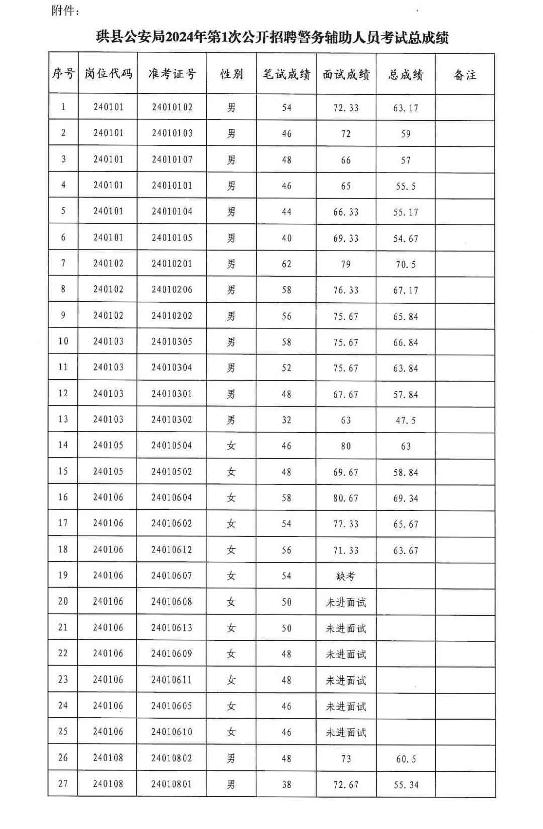 附件:珙县公安局2024年第1次公开招聘警务辅助人员考试总成绩