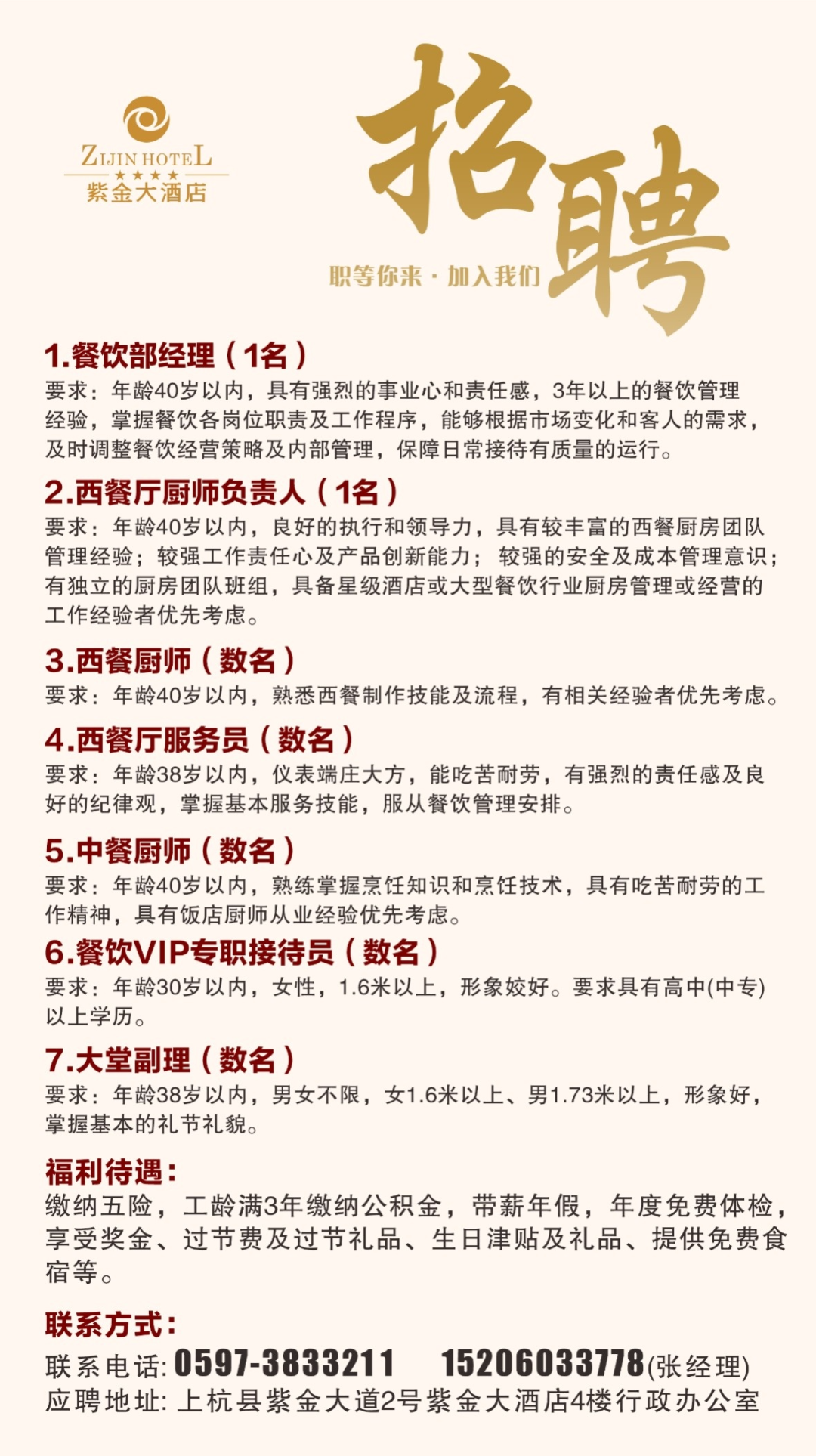 要求:年龄40岁以内,具有强烈的事业心和责任感,3年以上的餐饮管理经验,掌握餐饮各岗位职责及工作程序,能够根据市场变化和客人的需求,及时调整餐饮经营策略及内部管理,保障日常接待有质量的运行。