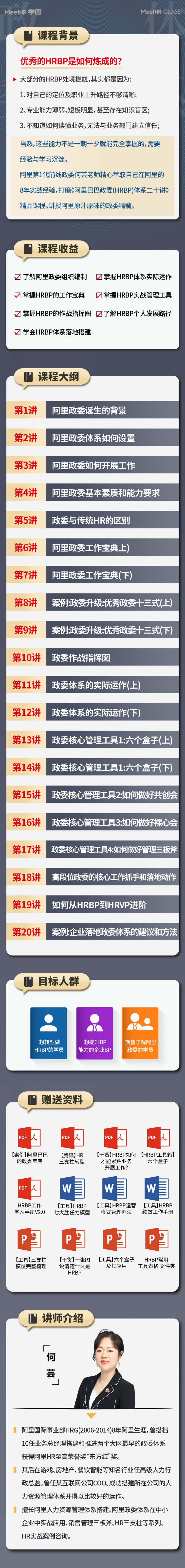 为了帮助HR们修炼内功,赋能业务,MeetHR 联合阿里国际事业部阿里第一代前线政委何芸老师隆重推出了《阿里巴巴政委体系20讲》系列课,融合阿里八年实战经验,讲授阿里原汁原味的阿里精髓。