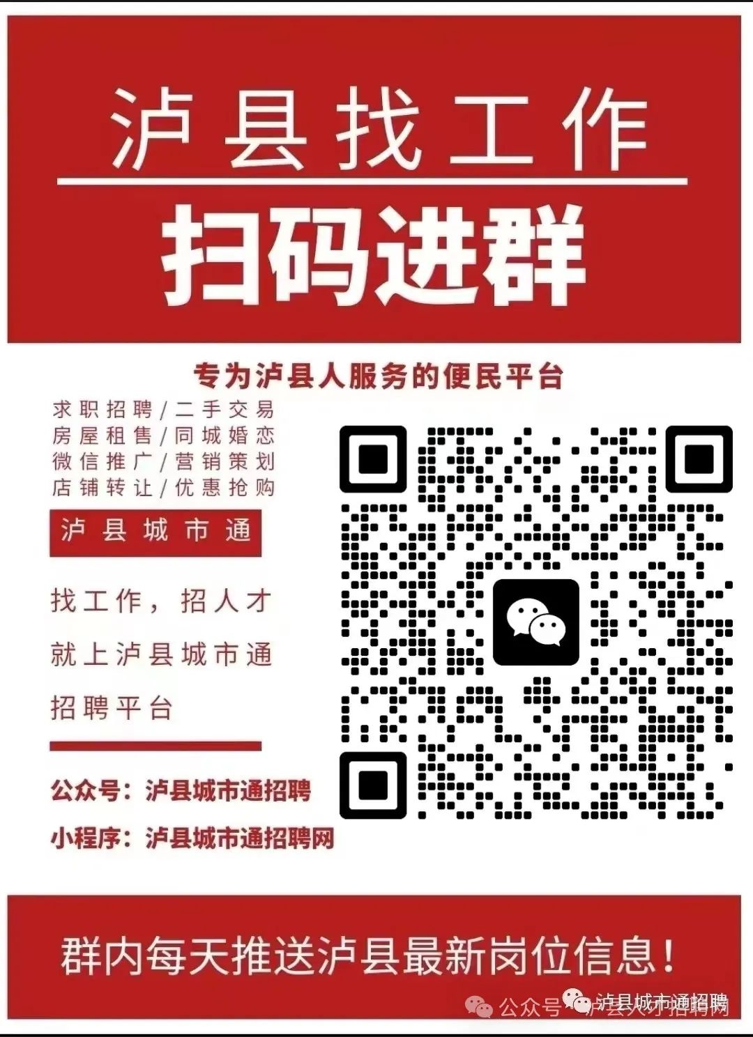 最近有想找工作的吗?泸县招聘频道又为大家更新了一批新的招聘职位,想找工作的都可以进来看看,说不定有你合适的工作!有亲朋好友想找工作也可以帮我们转发推荐,找工作找人才就上泸县!我们专注泸县本地招聘,致力于为您提供优质招聘求职服务!